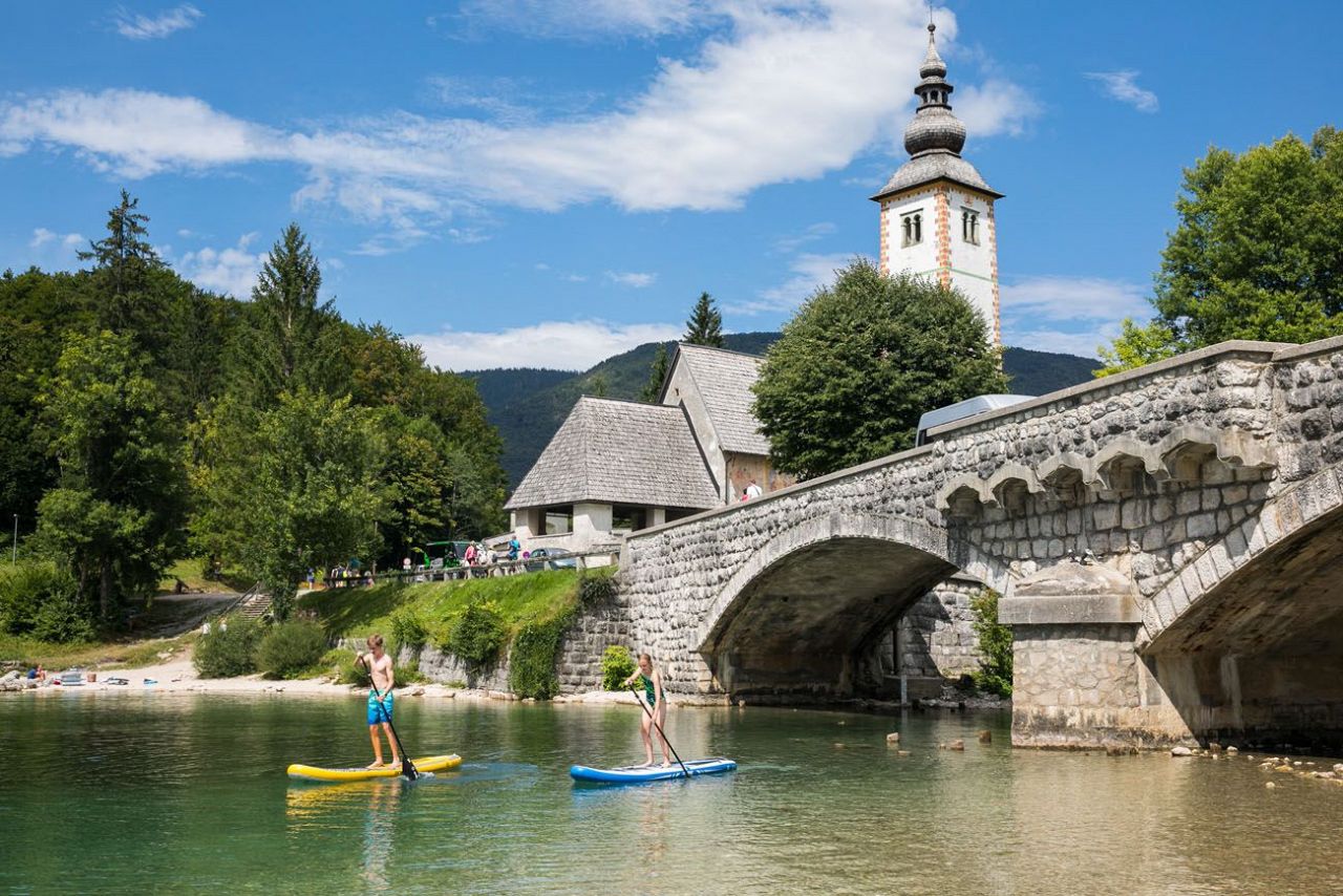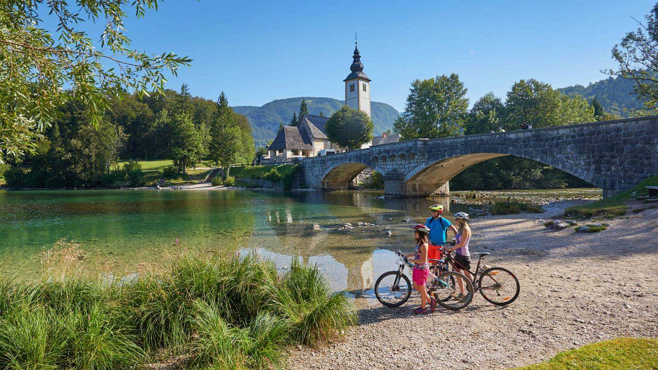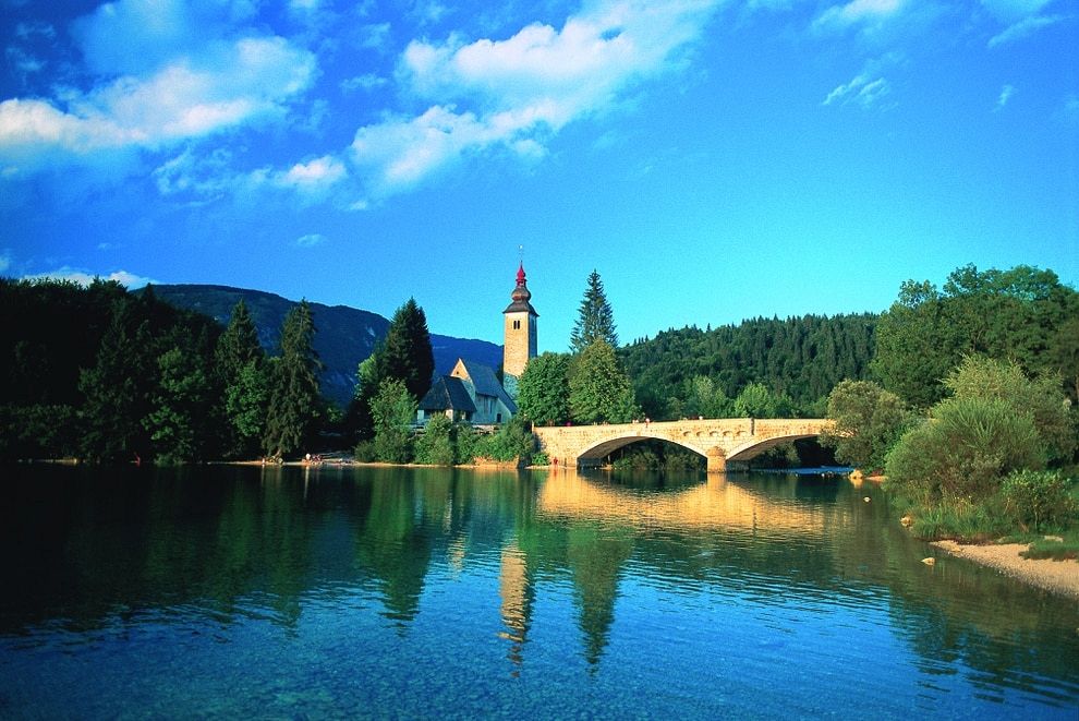 Direkt am Ostufer am Ortsausgang von Ribcev befindet sich die im 14. Jahrhundert errichtete Kirche Johannes des Täufers, direkt an der berühmten Steinbrücke. Sehenswert sind vor allem die Fresken. Der Hauptaltar stammt aus dem 17. Jahrhundert.